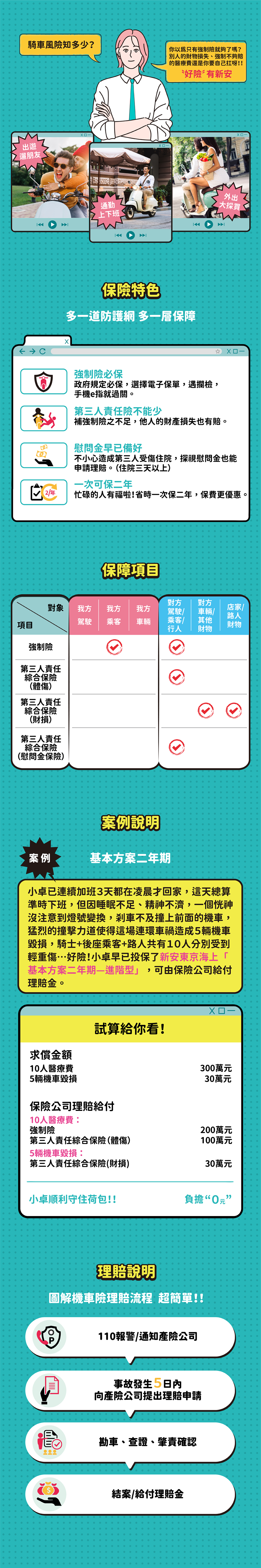 - 乘客責任保險:被保險人因使用或管理被保險機車發生意外事故,致乘客死亡、失能或受有體傷,依法應負賠償責任而受賠償請求時,對超過強制險給付標準以上之部分,對被保險人負賠償之責。