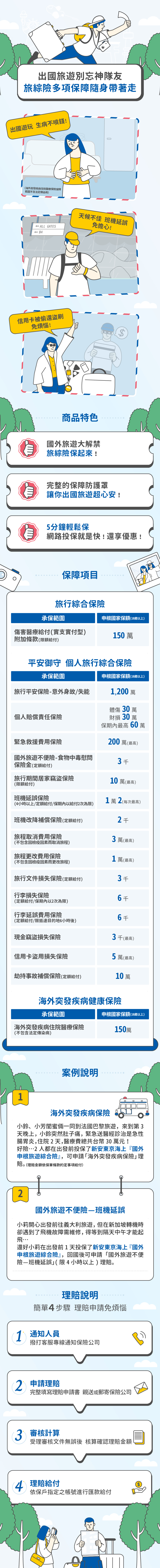 - 主要給付項目:旅行平安保險、個人賠償責任保險、食物中毒慰問保險金、旅行期間居家竊盜保險、傷害醫療保險金、班機延誤保險、班機改降補償保險、劫持事故補償保險、行李損失保險、行李延誤保險、旅行文件損失保險、旅程取消保險、旅程更改保險、現金竊盜損失保險、信用卡盜用損失保險、緊急救援費用保險、海外突發疾病住院醫療保險金。